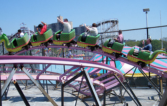 After conquering the Spook-A-Rama and Wonder Wheel we weren't done with Dino's yet as it has a kiddie coaster for all of us to conquer.