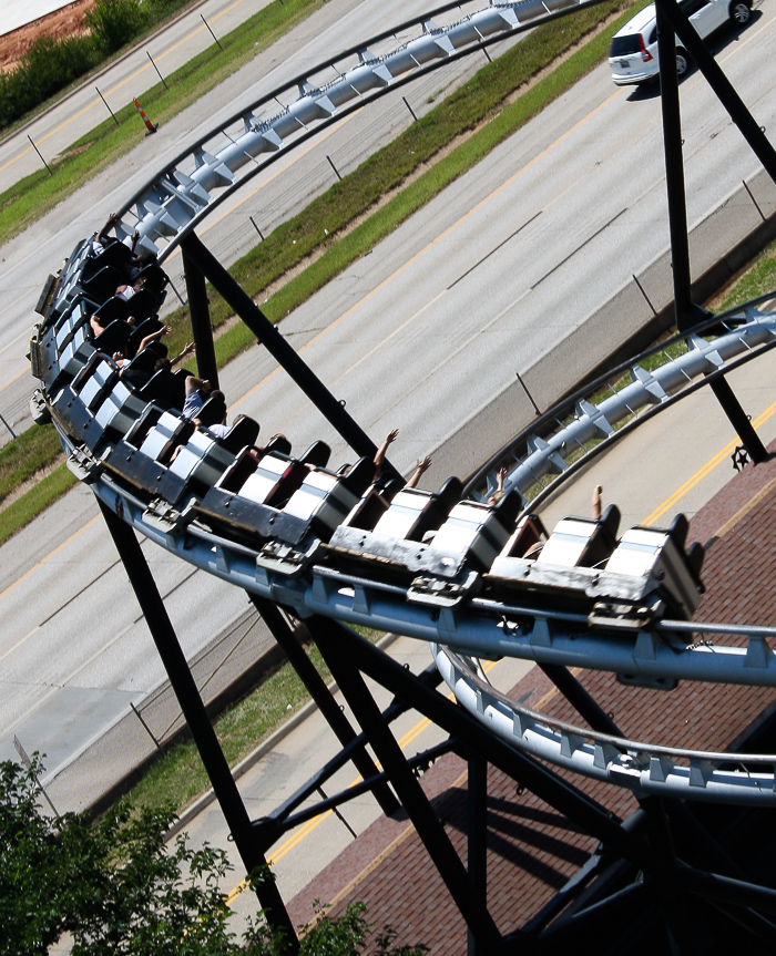 After a spiraling drop and the loop Silver Bullet turns you from side to
