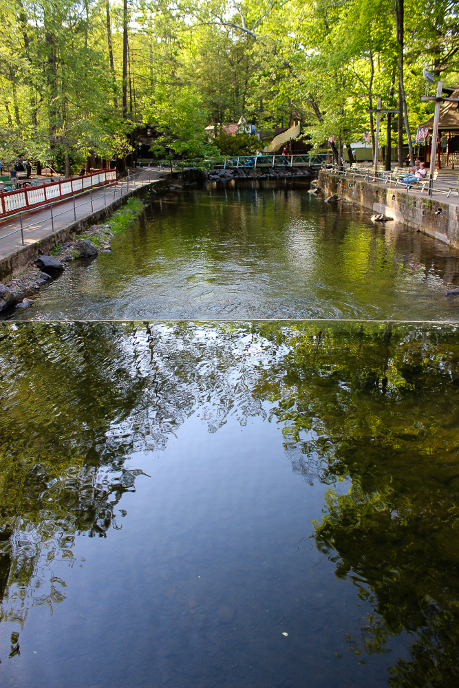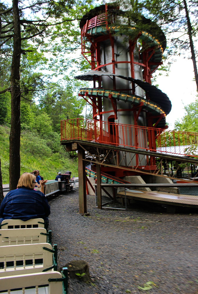 The Old Smoky Train goes along Knoebels eastern boundary and crosses Roaring