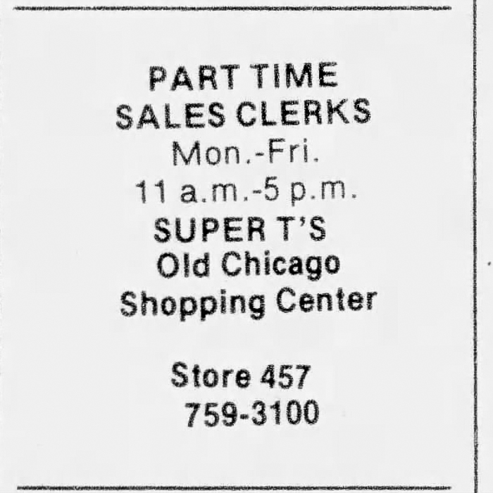 Old Chicago's Super T's T-Shirt Shop was hiring. Just give them a