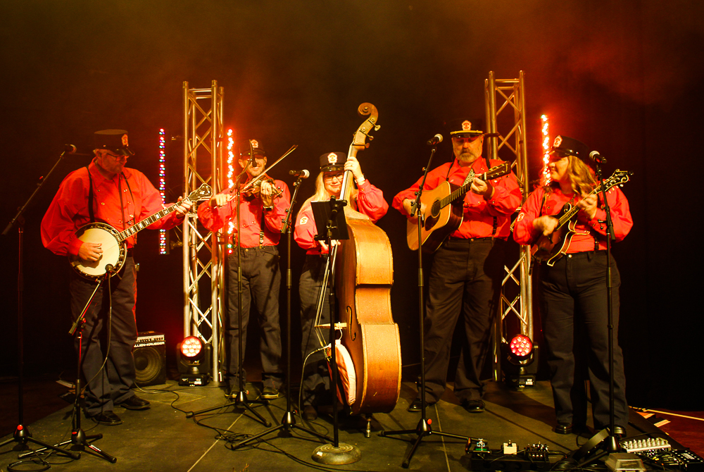 Boys all dressed up as firefighters playing songs like "The Fireman" or